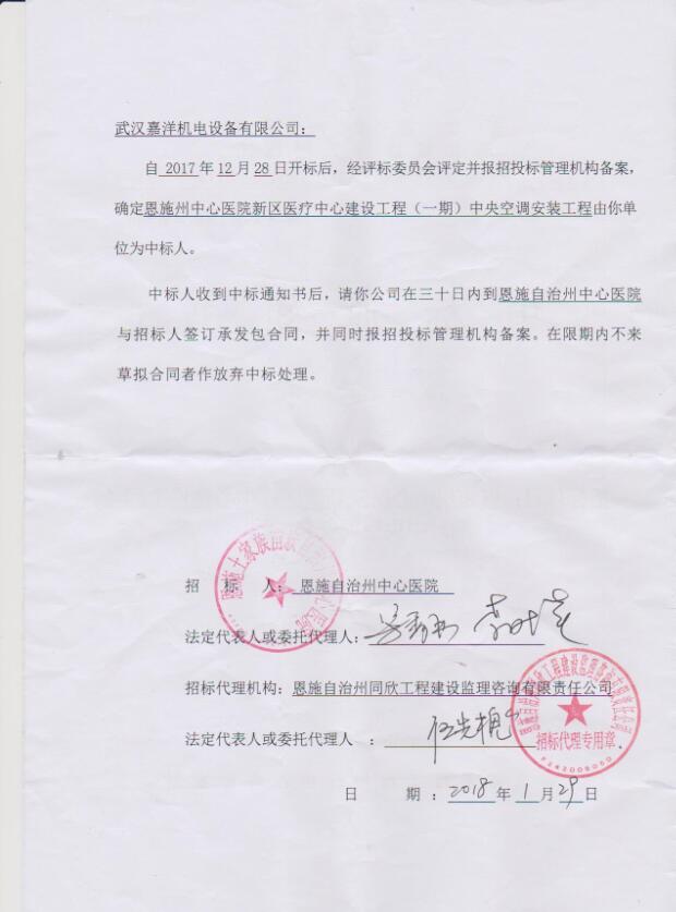 2018年1月29日武汉嘉洋机电设备有限公司在“恩施州中心医院新区医疗中心建设工程(一期)中央空调工程”项目中中标,在此向参与此次投标的同志们表示热烈祝贺,同时期望武汉嘉洋机电销售成员再接再励,再创业绩。